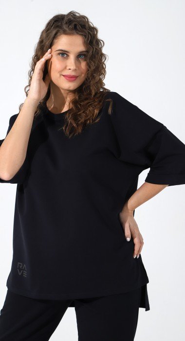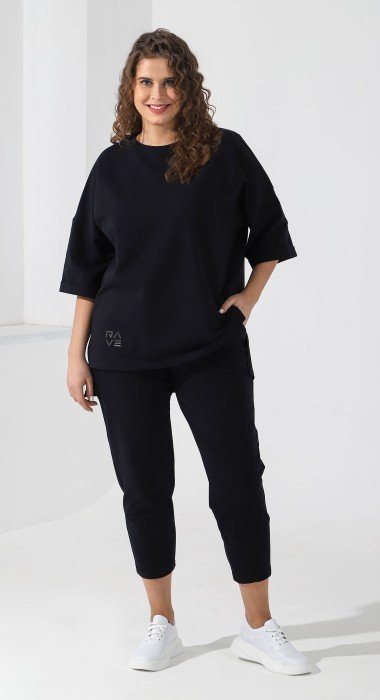 Костюм из гладкокрашеного трикотажного полотна «футер-двунитка», состоящий из свитшота и брюк. Свитшот – с рукавами ¾ длины на основе цельнокроеных, горловиной овальной формы и принтом на полочке. Горловина, низ рукавов и низ изделия отделаны притачными деталями из эластичного материала «кашкорсе» с люрексом. Брюки – длинные, на притачном поясе с эластичной тесьмой внутри и карманами в боковых швах. Передние половины брюк застрочены по линиям середины. Нижние срезы – с эластичной тесьмой.