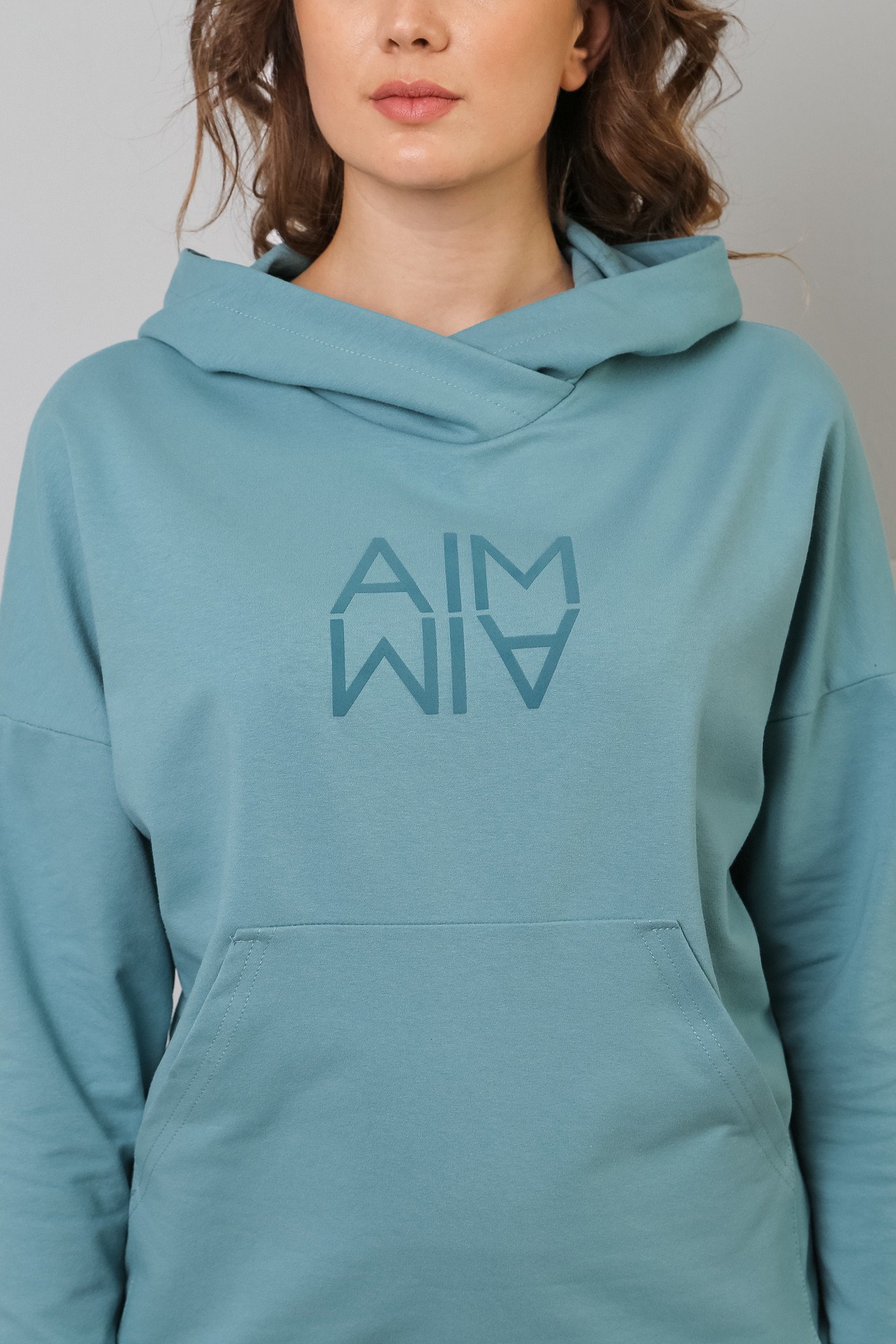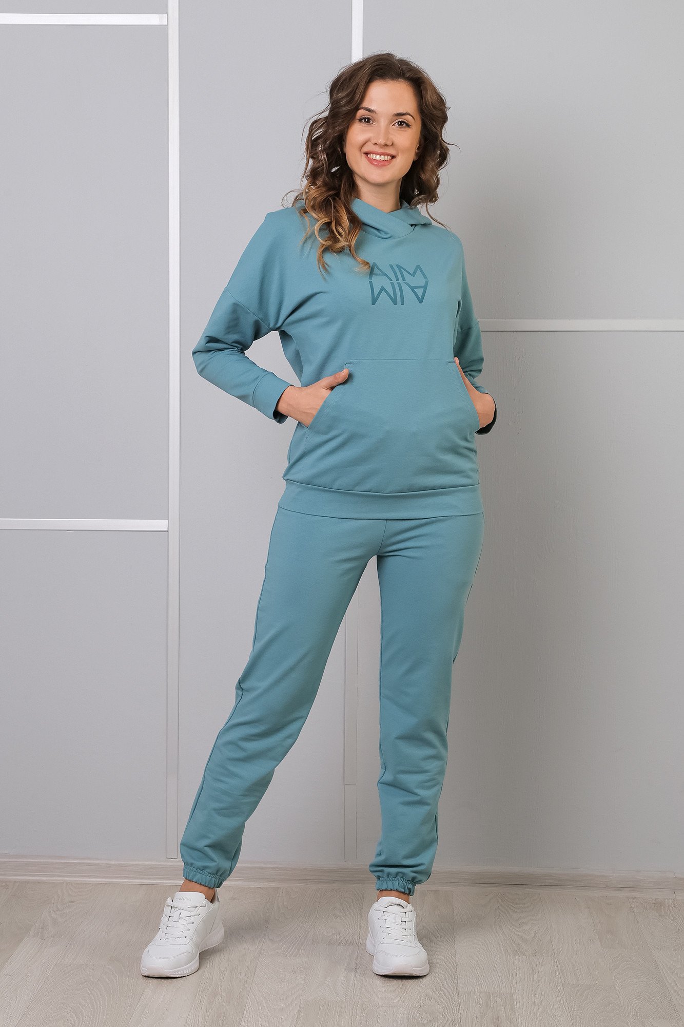 Костюм из гладкокрашеного трикотажного полотна «Футер-двунитка», состоящий из брюк и толстовки. Толстовка – свободного покроя, с длинными рукавами на основе цельнокроеных, капюшоном на подкладке и принтом на полочке. Рукава – с притачными манжетами. Низ изделия – с притачным поясом. На полочке – большой накладной карман «кенгуру». Брюки – длинные, на притачном поясе с эластичной тесьмой, карманами в боковых швах и резинкой по низу.