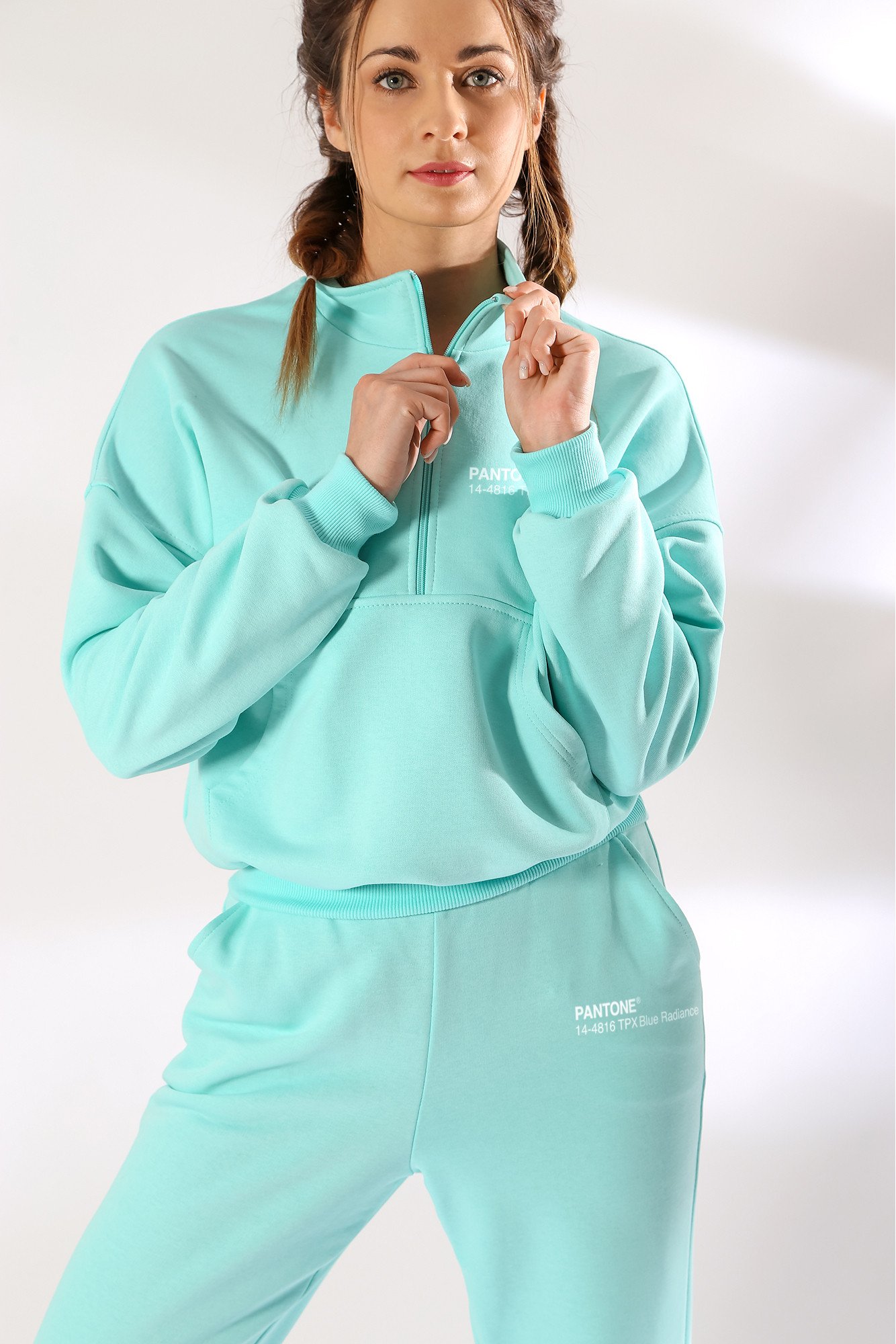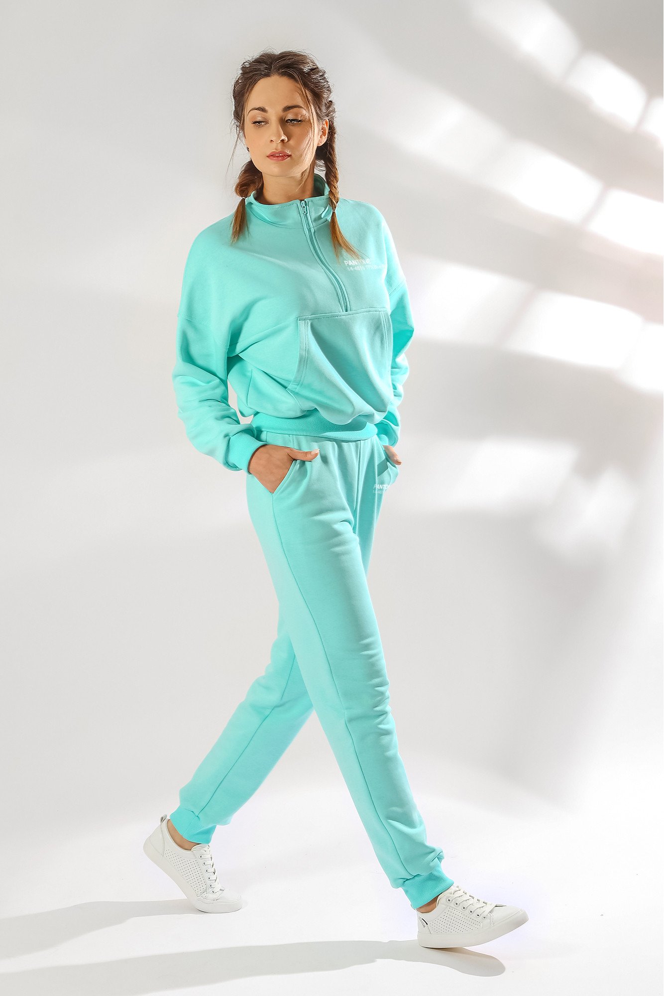 Женский костюм из петельчатого х/б футера. Джемпер с застёжкой "молнией" в верхней части, с воротником стойкой, карманом "кенгуру", лаконичным принтом. Брюки с боковыми карманами, на притачном поясе с эластичной тесьмой. Пояс брюк, манжеты по низу джемпера, рукавов и брюк - из "кашкорсе".