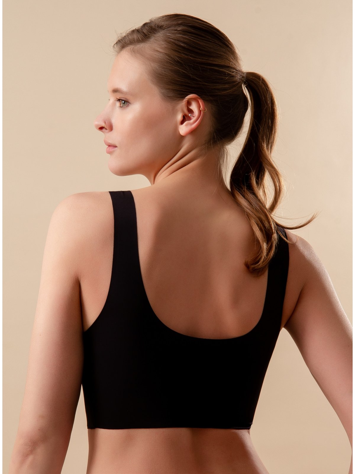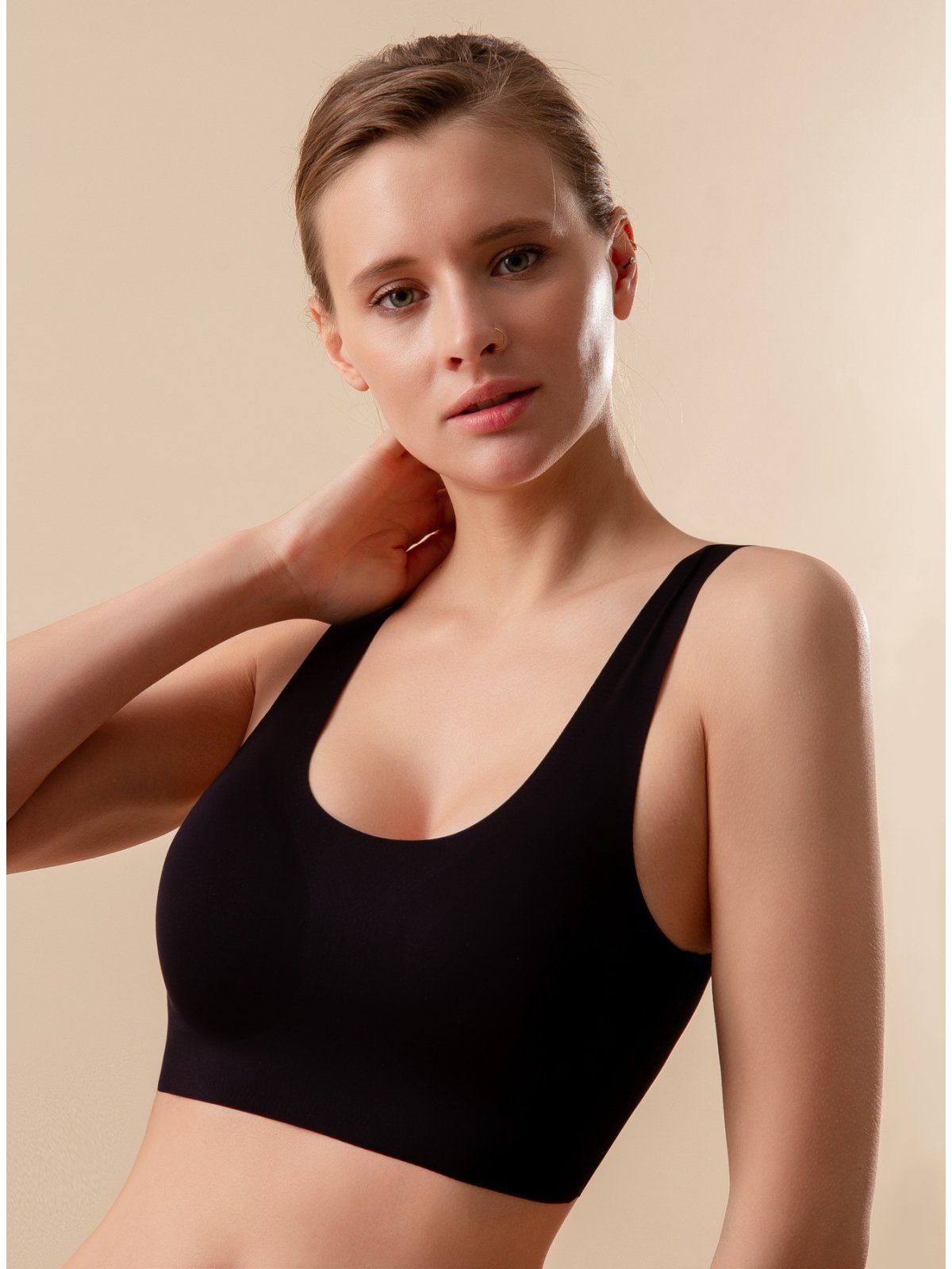 Бесшовный бюстгальтер-топ черного цвета на широких бретелях, изготовлен из эластичной синтетической ткани с высококачественной обработкой срезов. Топ дополнен съемными чашками из тонкого поролона, без Push-up, и без косточек. Отсутствие швов позволяет изделию оставаться незаметным под одеждой и обспечивать максимальный комфорт и облегание при носке.