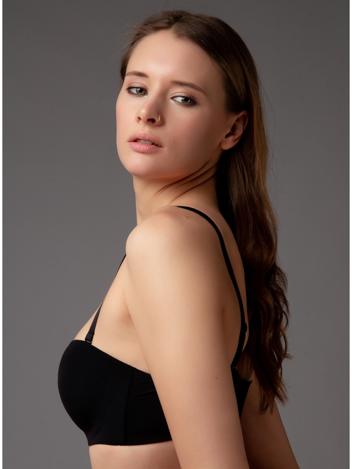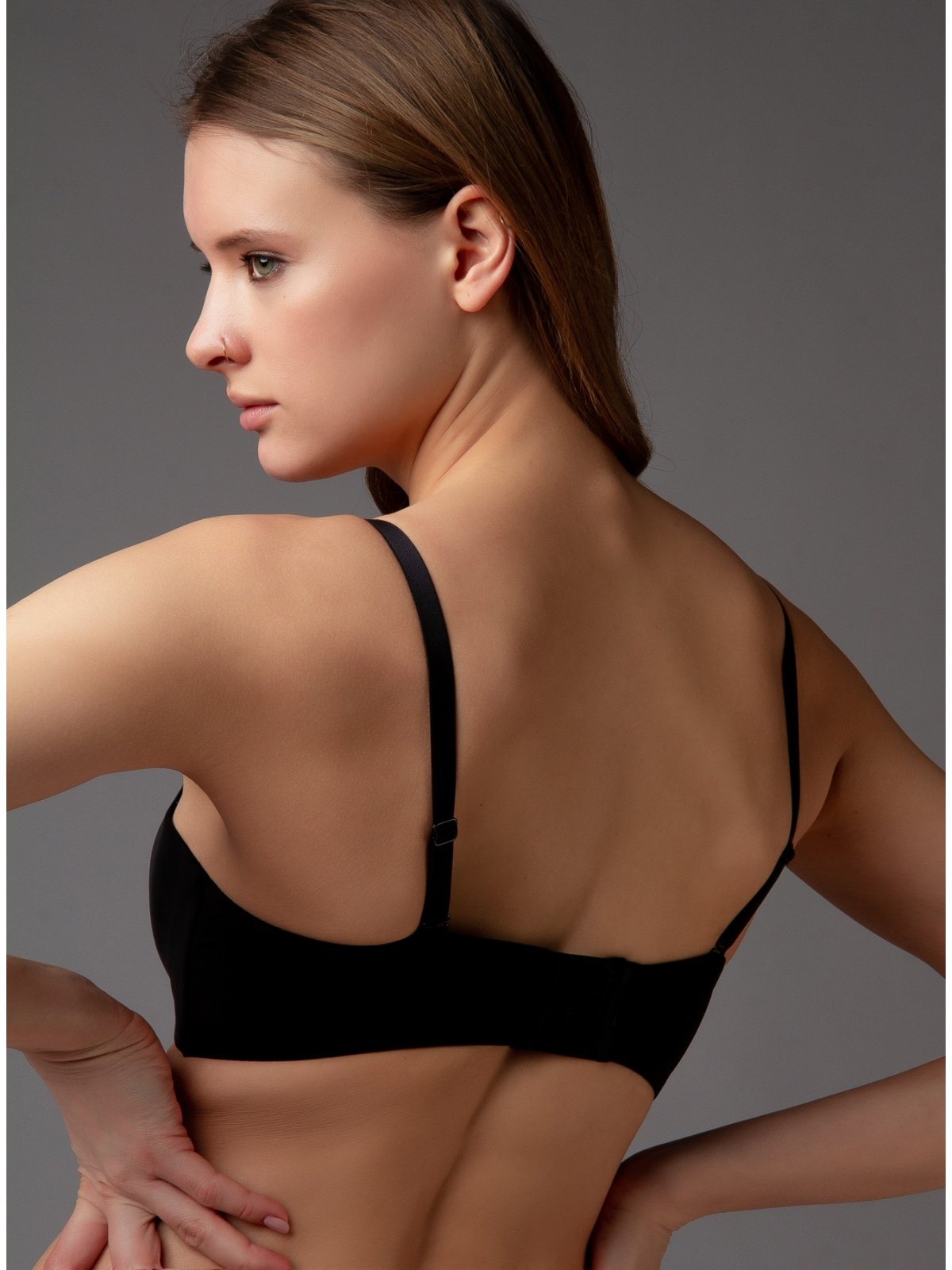 Бюстгальтер от торговой марки Индефини. Бюстгальтер из полиамида, черного цвета, на косточках, с поролоновой подкладкой, без Push-up, с косточками по бокам, на широких отстегивающихся лямках, на широком поясе, лямки регулируются.