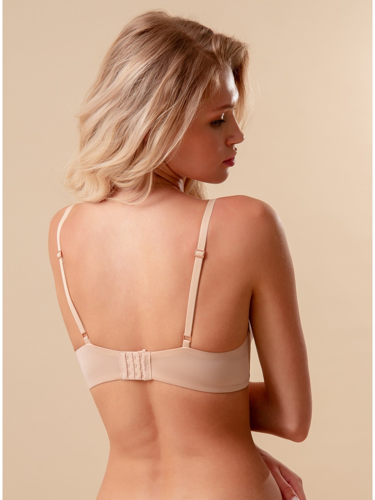 Бюстгальтер от торговой марки Индефини. Бюстгальтер бежевого цвета без косточек с Push-up, с формованными чашками, на тонких регулируемых бретелях, пояс регулируется застежками-крючками.