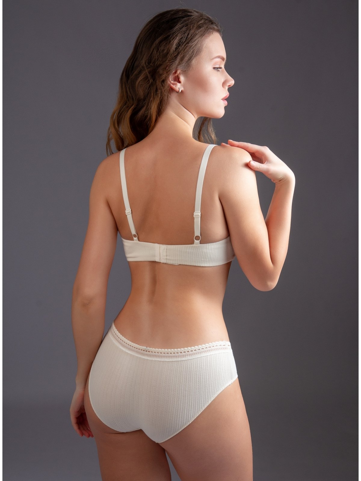 Комплект нижнего белья от торговой марки Индефини. В комплекте бюстгальтер и трусики. Бюстгальтер молочного цвета изготовлен из эластичного хлопка, дополнен кружевными вставками и обрамлением, не имеет косточек под чашками и Push-up, с треугольными уплотненными чашками с косточками по бокам для лучшей поддержки груди, фиксируется регулируемыми бретелями и поясом на застежках-крючках. Трусы-слипы бежевого цвета изготовлены из мягкого хлопка с кружевными вставками и обрамлением, средней посадки, фиксируются мягкой резинкой.