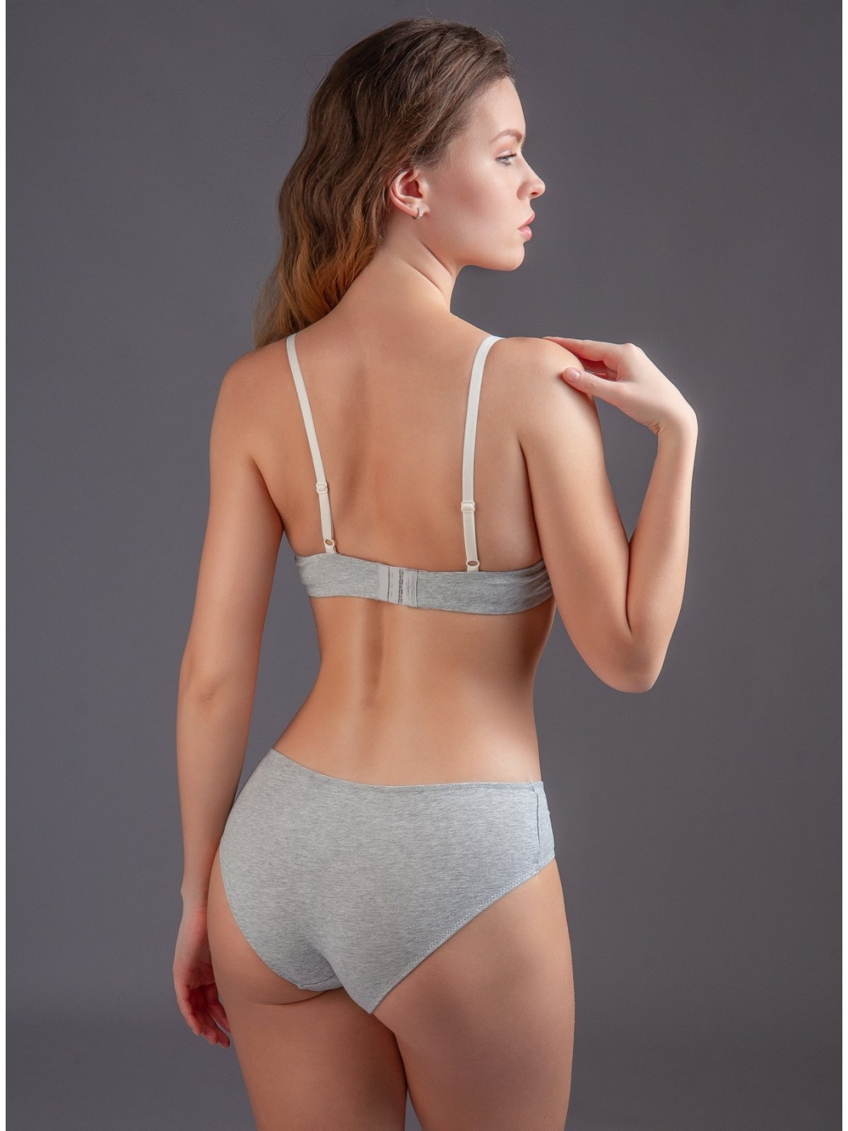 В комплекте бюстгальтер и трусики. Бюстгальтер серого цвета изготовлен из хлопка с небольшим добавлением эластана и с кружевными вставками, с формованной чашкой без Push-up на косточках, на тонких регулируемых бретелях, пояс фиксируется застежками-крючками. Трусы-слипы средней посадки серого цвета изготовлены из хлопка с кружевными вставками, на мягкой резинке.