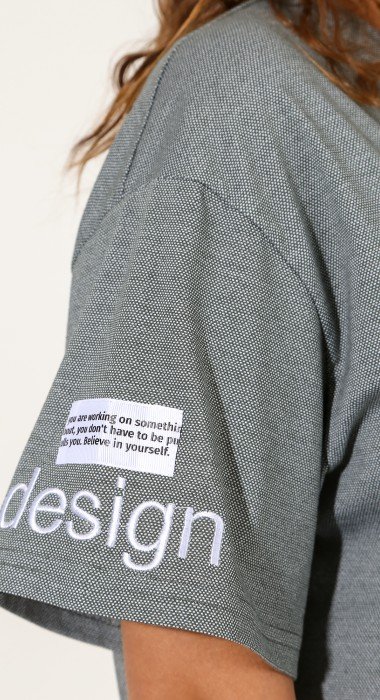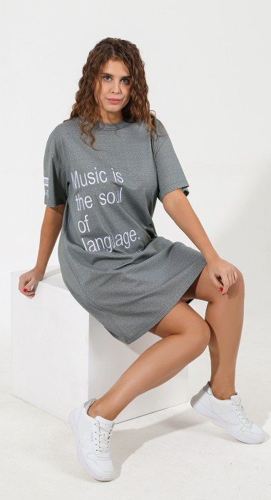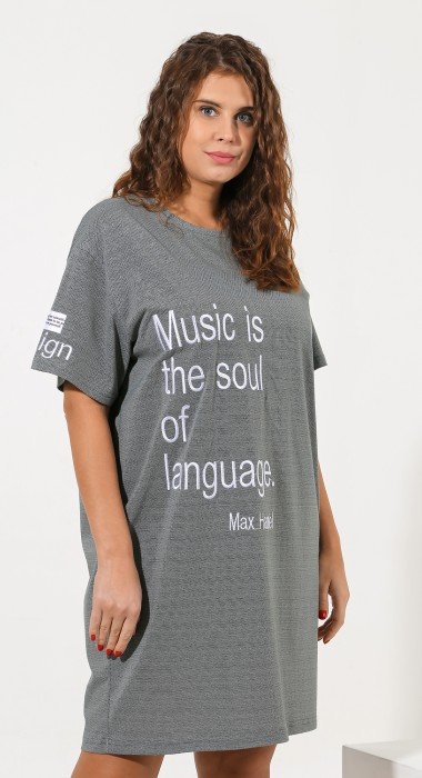 Туника из трикотажного полотна «кулирка» с мелкоузорчатым рисунком, свободного покроя, со спущенной линией плеча, короткими втачными рукавами и горловиной овальной формы, обработанной притачной бейкой. На правом рукаве и в центре переда – вышивка. На правом рукаве, выше вышивки настрочен декоративный элемент прямоугольной формы из репсовой тесьмы с печатным текстом.