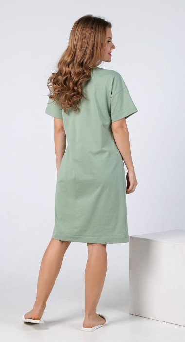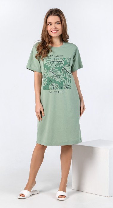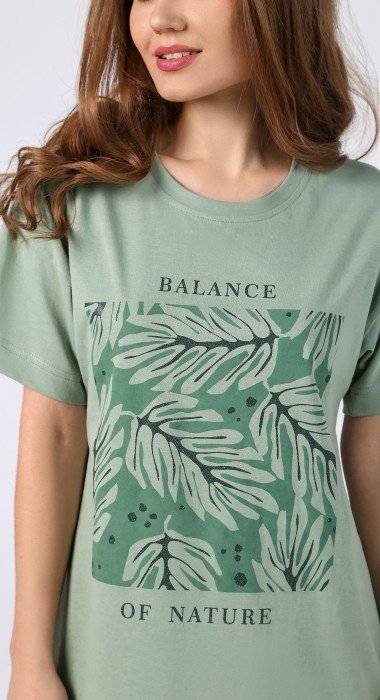 Туника из трикотажного гладкокрашеного полотна, прямого силуэта, с короткими рукавами на основе цельнокроеных, горловиной овальной формы, обработанной притачной бейкой и принтом на полочке, выполненным методом шелкографии.